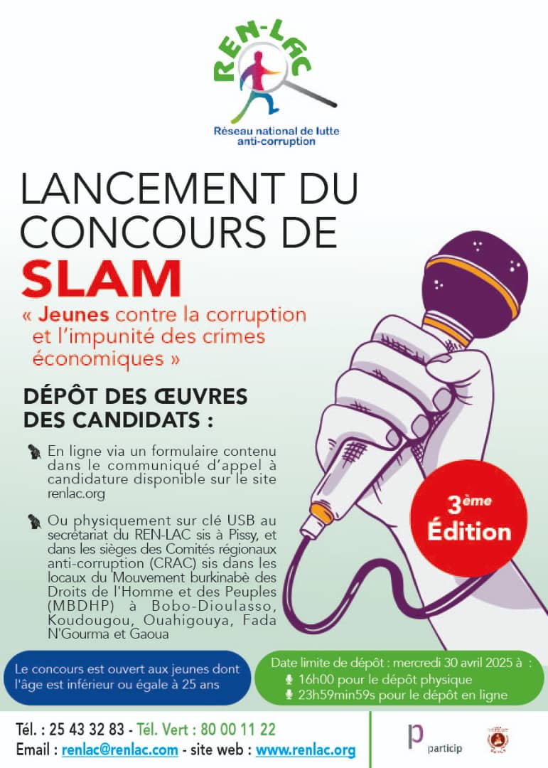Dans le cadre de ce projet, le REN-LAC organise la troisième édition du concours slam dénommé « Jeunes contre la corruption et l’impunité des crimes économiques ». Cette édition se tiendra sur le thème « La corruption en milieu scolaire ». Le concours vise à promouvoir auprès des jeunes l’émergence d’une tribune populaire d’expression libre contre les méfaits de la corruption et de l’impunité des crimes économiques dans la société burkinabè. Il est ouvert aux jeunes dont l’âge est inférieur ou égale à 25 ans.